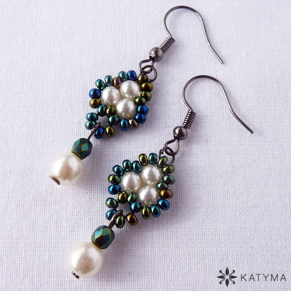Náušnice šité z rokajlu Preciosa, broušených korálků a voskových perliček.