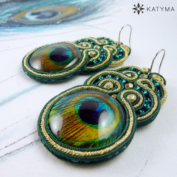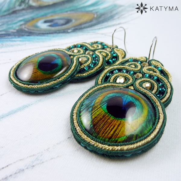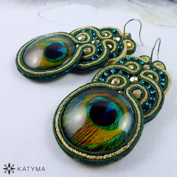 Základem náušnic jsou krásné skleněné kamínky s pavími oky zdobené sutaškami v tmavě zelené barvě a zlaté barvě. Použity jsou zlaté ohňovky a petrolejově zelený český kulatý rokajl Preciosa.