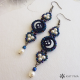 Náušnice šité z modrotiskových buttonků, voskových perliček, broušených korálků a rokajlu Preciosa.
