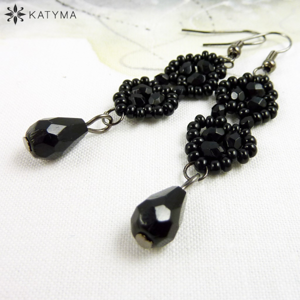 Náušnice šité z rokajlu Preciosa v černé barvě, černých ohňovek a černých broušených slziček.