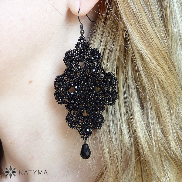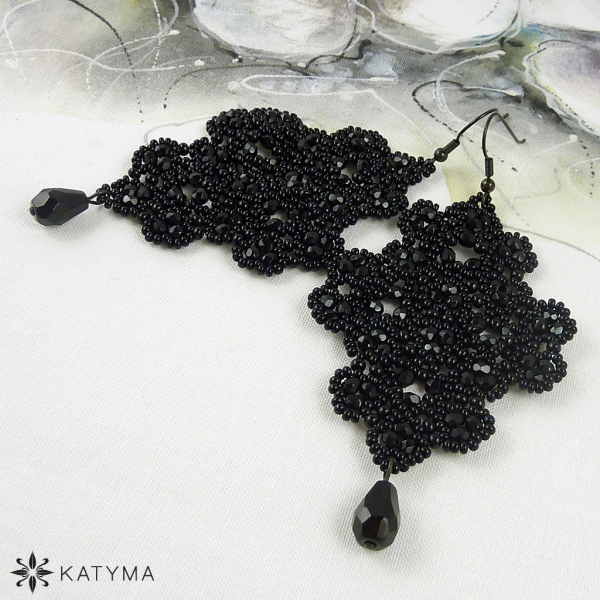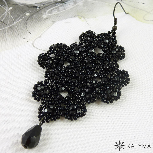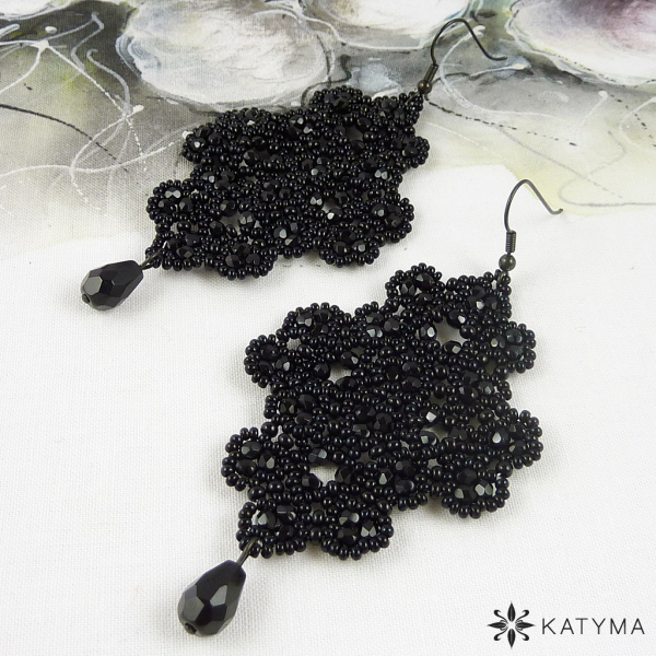 Černé šité krajkové náušnice z černých broušených korálků a čerkého českého kulatého rokajlu Preciosa.