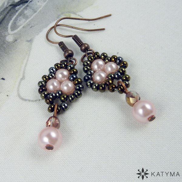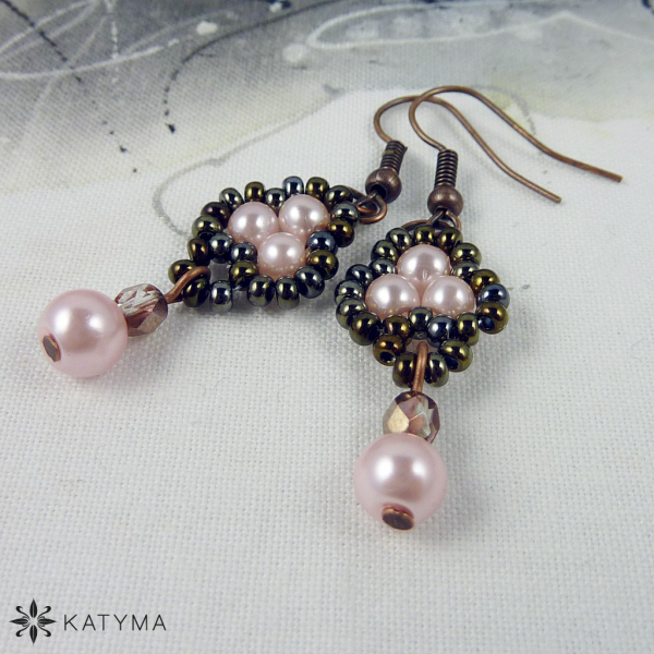 Náušnice šité z rokajlu Preciosa v barvě hnědý iris, světle růžových voskových perliček a měděných broušených korálků.