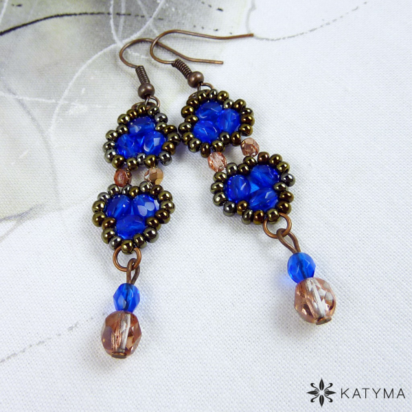 Náušnice šité z rokajlu Preciosa v barvě hnědý iris, královsky modrých broušených korálků a měděných broušených korálků.