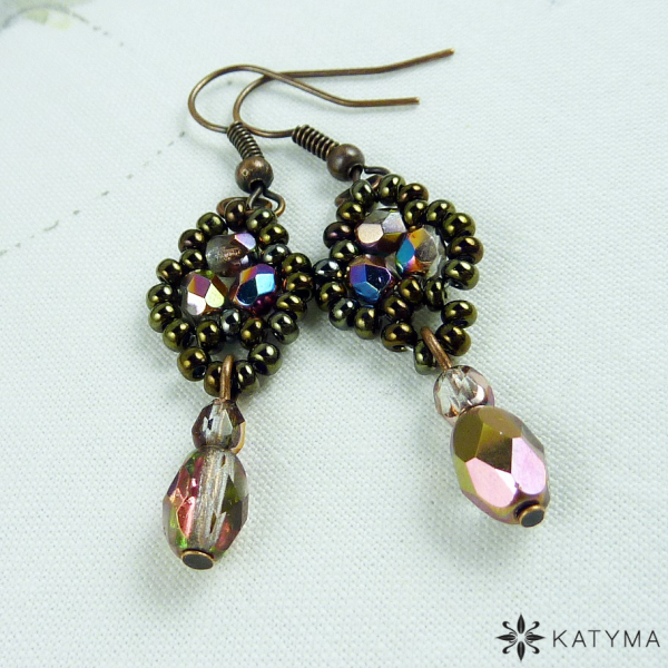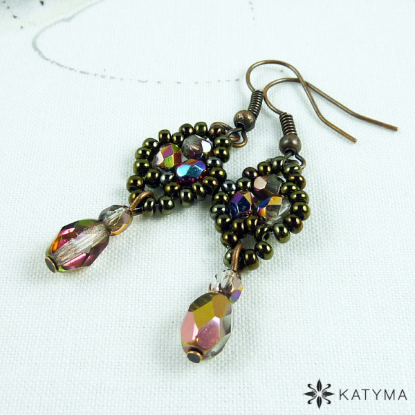 Náušnice šité z rokajlu Preciosa v barvě hnědý iris a měděných pokovených broušených korálků s AB duhovýn efektem.