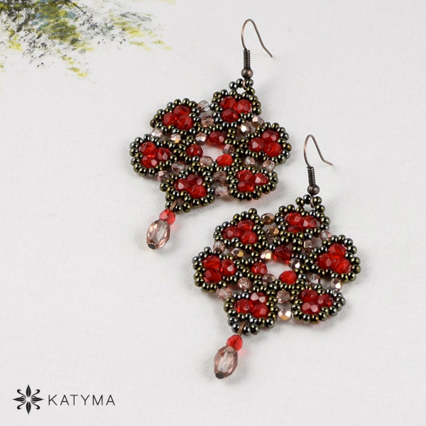 Šité náušnice šité z červených broušených korálků, rokajlu hnědý iris a měděných pokovených broušených korálků.