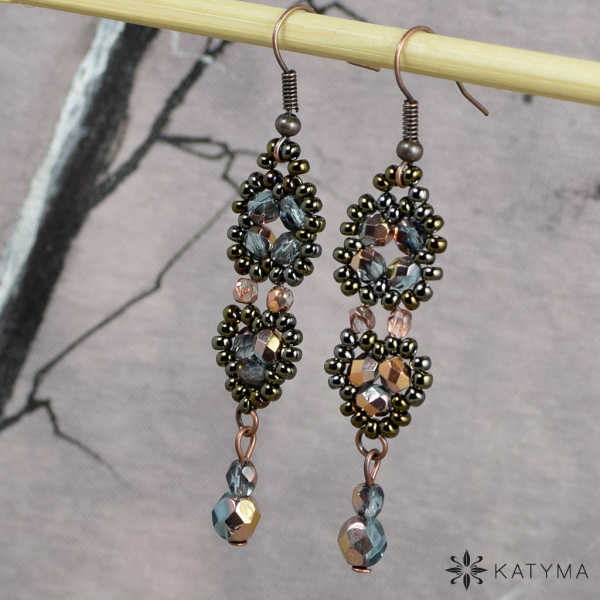 Náušnice šité z rokajlu Preciosa v barvě hnědý iris, šedých a měděných broušených korálků.