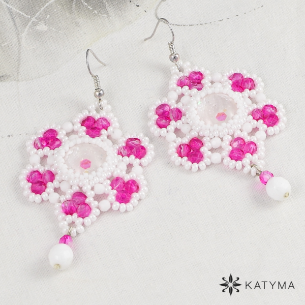 Zobrazit v plné velikosti Náušnice šité z broušených korálků a bílého lesklého rokajlu.