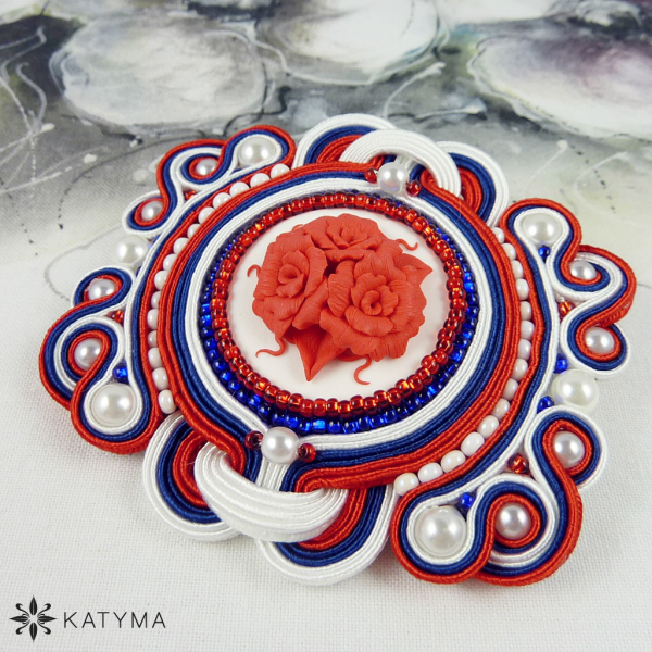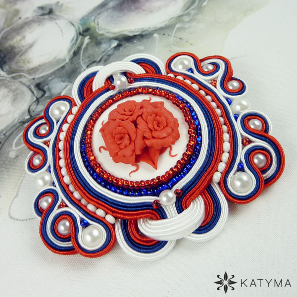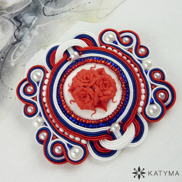 Sutašková brož s krásným ručně vyrobeným kabošonkem z polymerové hmory se třemi červenými růžičkami, který vytvořila paní Olena Nikolayeva.