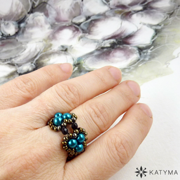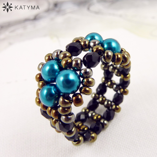Prsten s ozdobou z tyrkysových perliček, černých broušených korálků a českého kulatého rokajlu Preciosa v barvě hnědý iris.