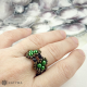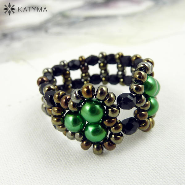 Prsten s ozdobou ze zelených perliček, černých broušených korálků a českého kulatého rokajlu Preciosa v barvě hnědý iris.