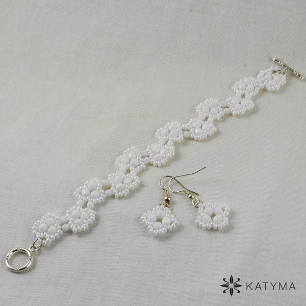 Zobrazit v plné velikosti Komplet náramku a náušnic laděný ve sněhobílé barvě.