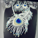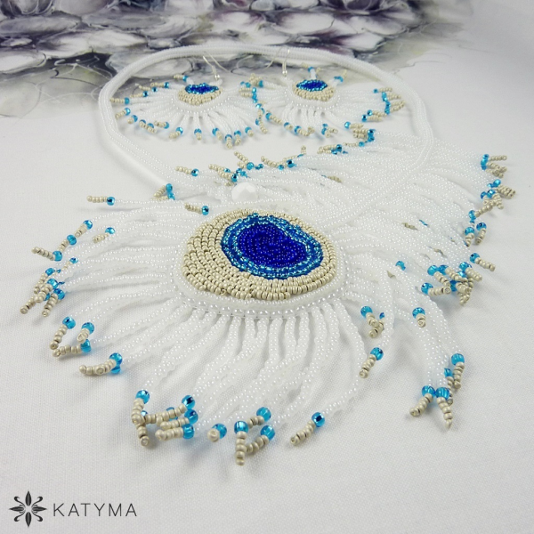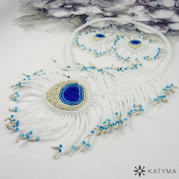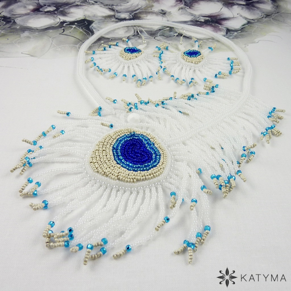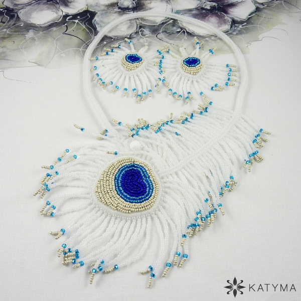 Komplet autorského náhrdelníku a náušnic ze šitých per laděný do bílé, stříbrné, tyrkysové a tmavě modré barvy.