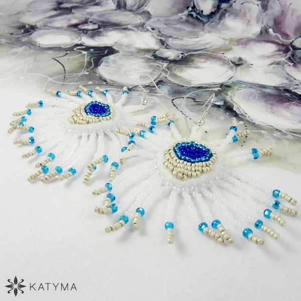 Použitý materiál je český rokajl Preciosa lesklé mléčně bílé, tyrkysové, stříbrné matné a tmavomodré barvy, ohňovka bílé barvy a náušnicové háčky stříbrné barvy. (možnost vyměnit za chirurgickou ocel, kontaktujte mě a domluvíme se)