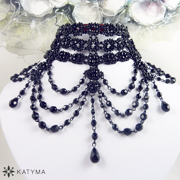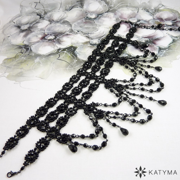 Náhrdelník je vytvořen z černých lesklých broušených korálků a českého kulatého rokajlu Preciosa černé barvy.