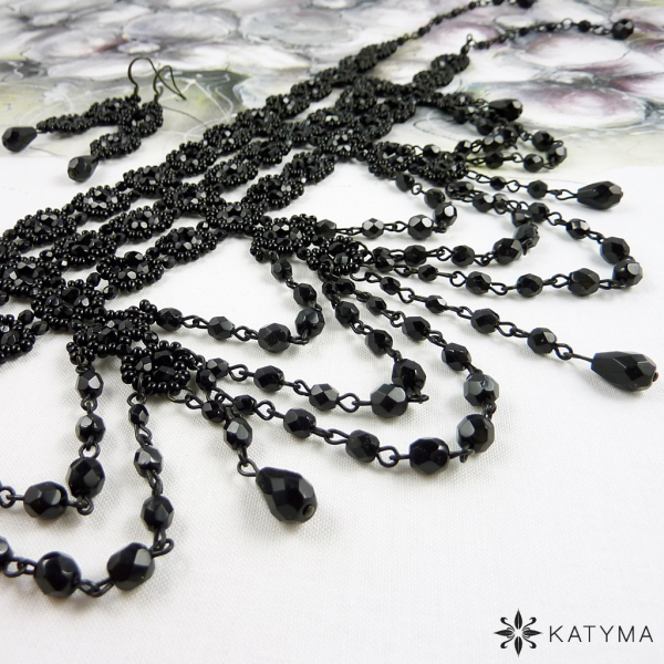 Šitý a ketlovaný náhrdelník s náušnicemi z černé bižuterie