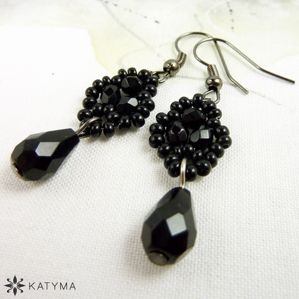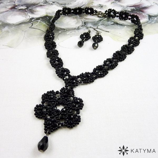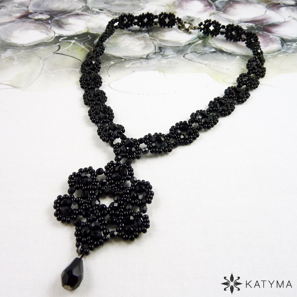 Náhrdelník je vytvořen z černých lesklých broušených korálků a českého kulatého rokajlu Preciosa černé barvy.