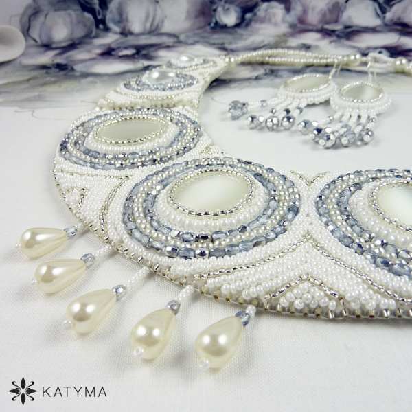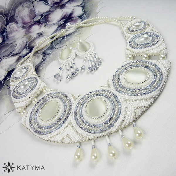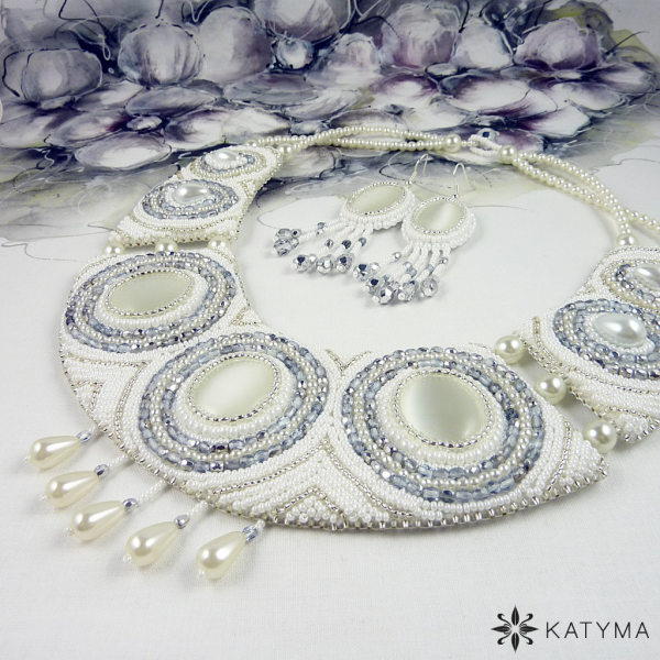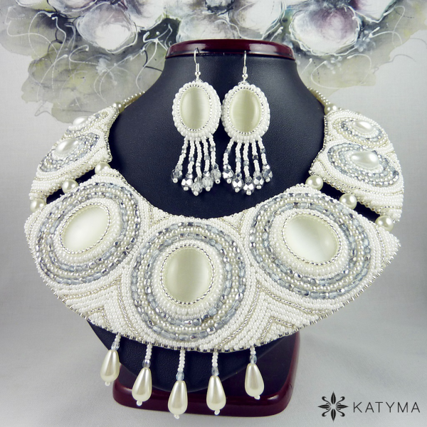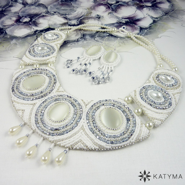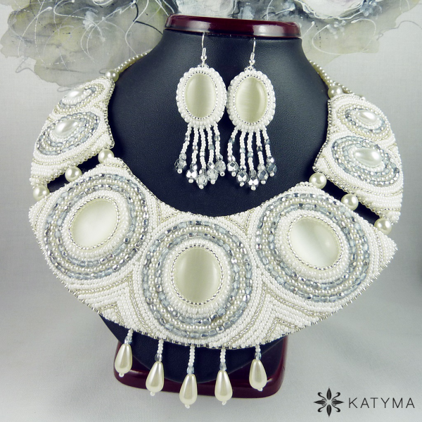 Dominantou náhrdelníku jsou tři krásná bílá kočičí oka oválného tvaru. Náhrdelník je vyšit perleťovým a stříbrný rokajlem, bílými voskovými perličkami a stříbrnými ohňovkami.