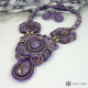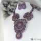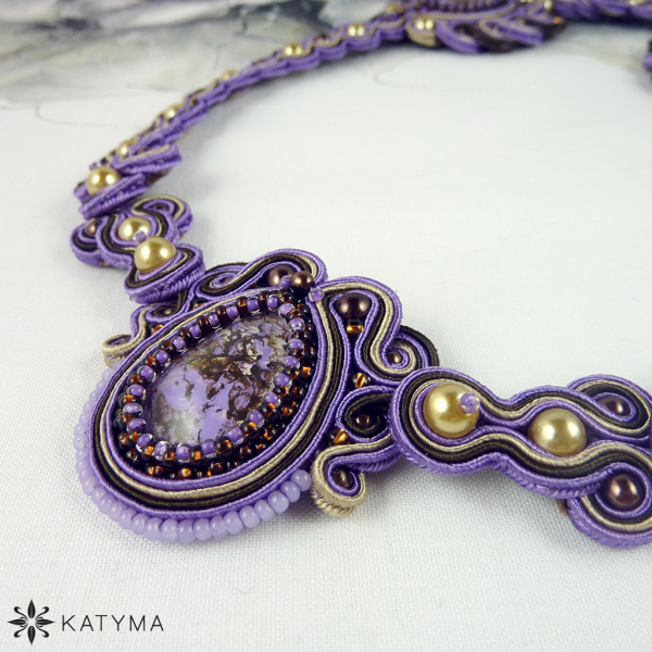 Použity jsou sutašky tmavě hnědé, fialové a světle hnědé barvy, hnědý a dva druhy fialového českého rokajlu Preciosa, voskové zlaté a hnědé voskové perličky různých velikostí.