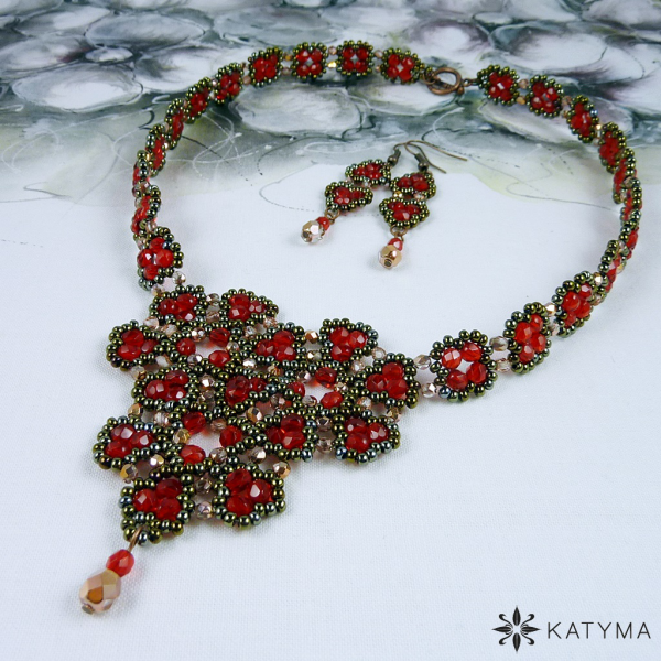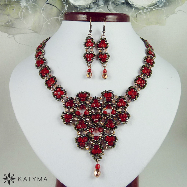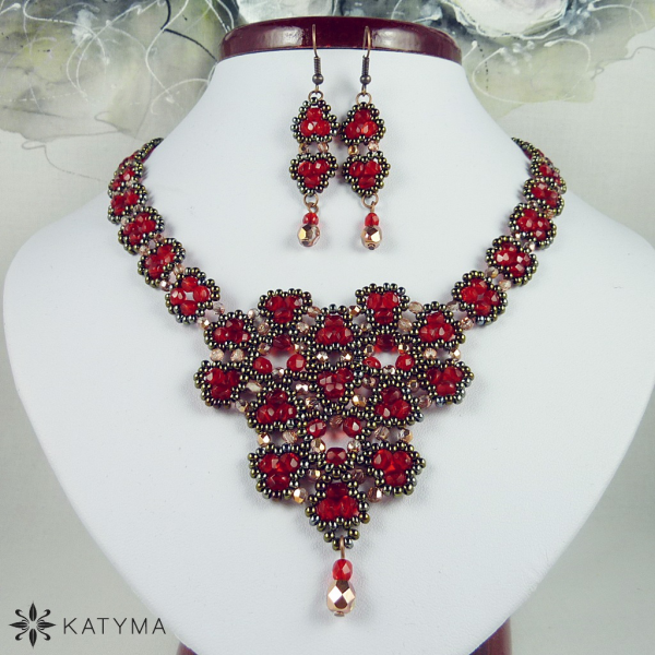 Komplet náhrdelníku a náušnic laděný do červené a měděné barvy.