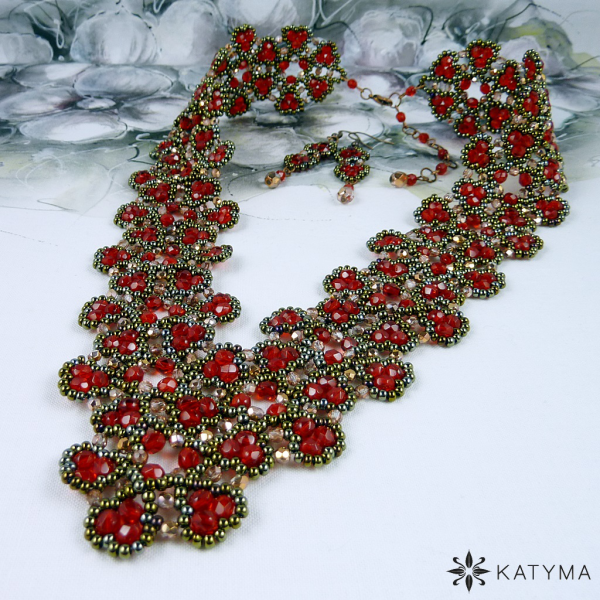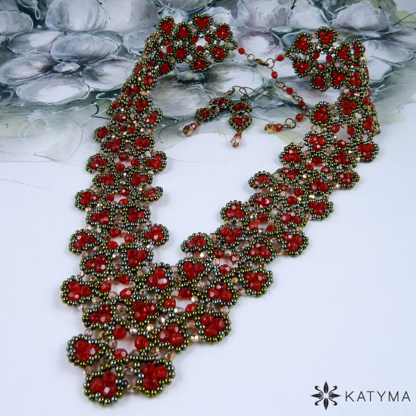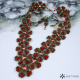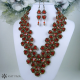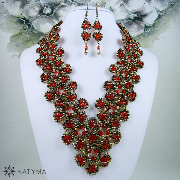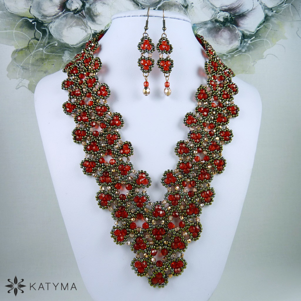 Komplet náhrdelníku a náušnic laděný do jasně červené, měděné barvy a barvy hnědého irisu.