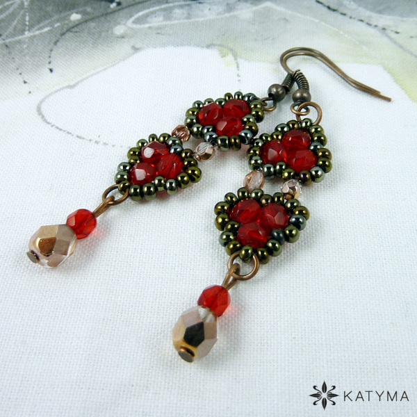 Náhrdelník je vytvořen ze světle červených broušených korálků , pokovených měděných broušených korálků a rokajlu Preciosa v barvě hnědý iris.