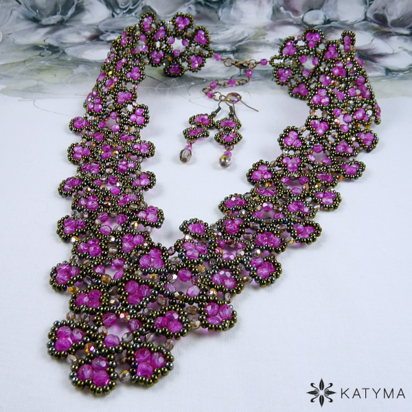 Náhrdelník je vytvořen z fuchsiově růžových broušených korálků částečně krystalově průhledných, pokovených měděných broušených korálků s fuchsiovým pokovem a rokajlu Preciosa v barvě hnědý iris.