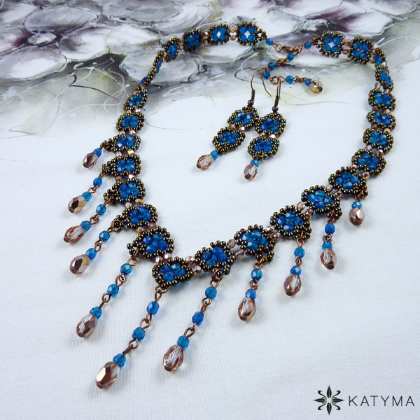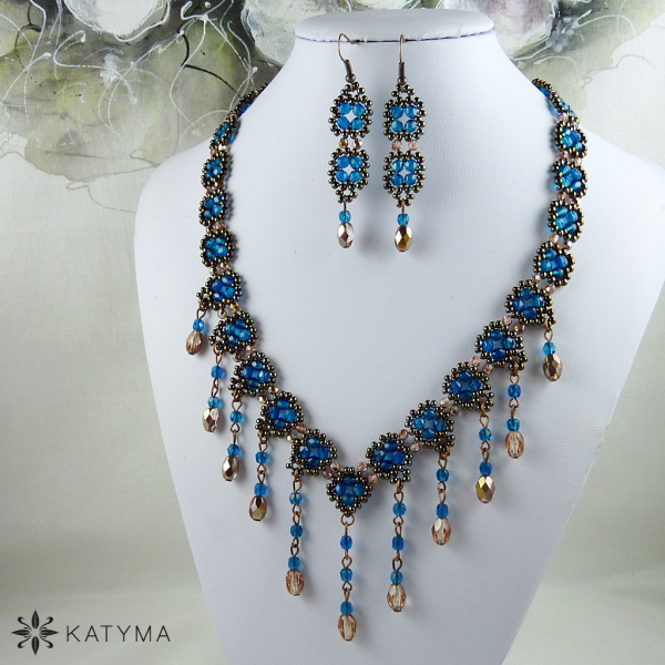 Komplet náhrdelníku a náušnic laděný do mořsky modré barvy.