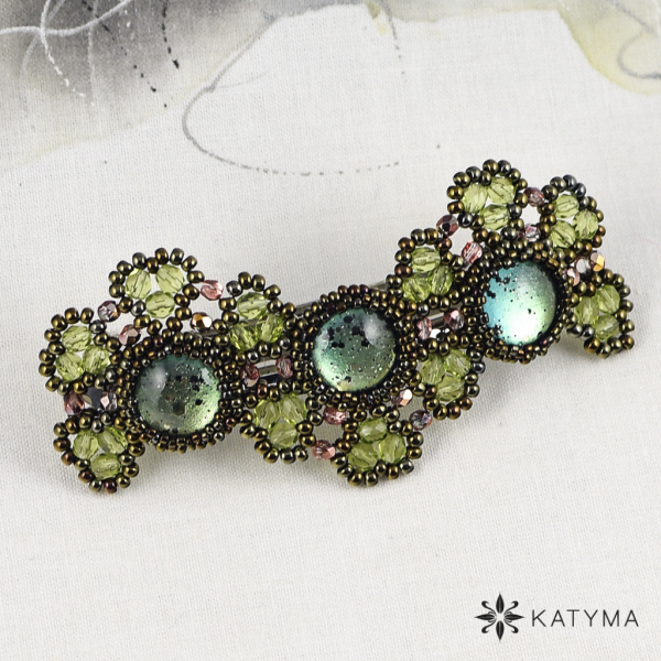 Spona je vytvořena ze 3 obšitých malovaných kabošonů. Kabošonky jsou obšité kulatým rokajlem Preciosa toho-rokajlem ve stejné barvě.