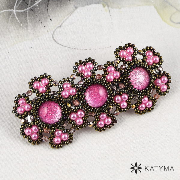 Spona je vytvořena ze 3 obšitých malovaných kabošonů. Kabošonky jsou obšité kulatým rokajlem Preciosa a toho-rokajlem.