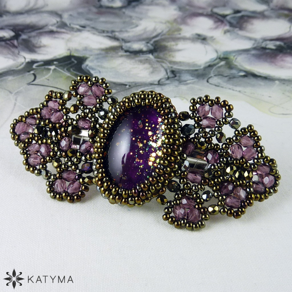 Spona je vytvořena z ručně malovaného oválu. Kabošon je obšitý kulatým rokajlem Preciosa a toho-rokajlem stejné barvy.