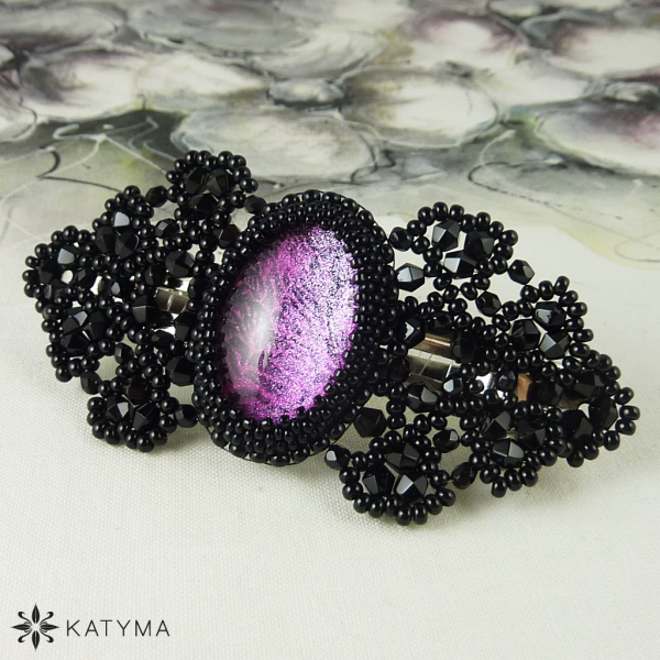 Spona je vytvořena z ručně malovaného oválu. Kabošon je obšitý kulatým rokajlem Preciosa a toho-rokajlem stejné barvy.
