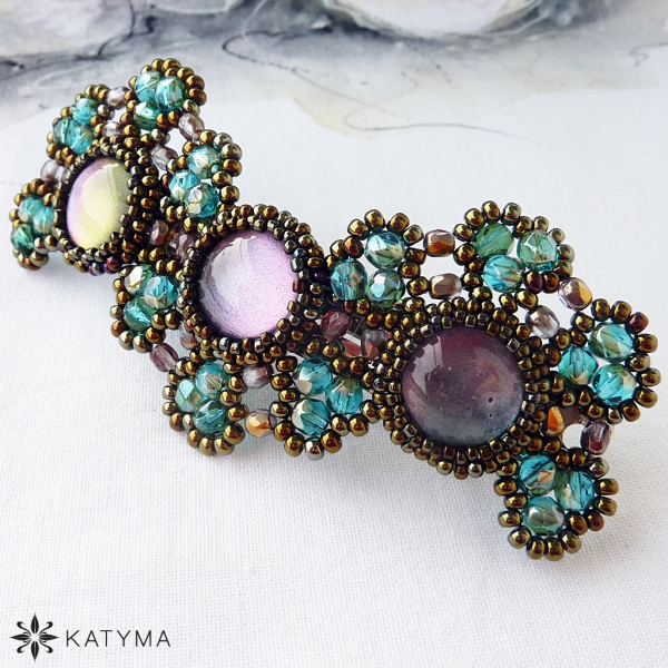 Spona je vytvořena ze 3 obšitých malovaných kabošonů. Kabošonky jsou obšité kulatým rokajlem Preciosa toho-rokajlem ve stejné barvě.