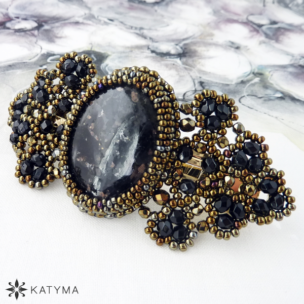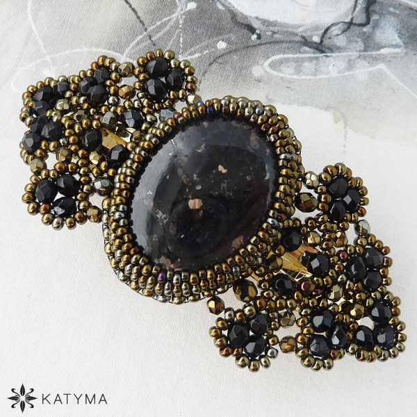 Spona je vytvořena z minerálu ve tvaru oválu. Kabošon je obšitý kulatým rokajlem Preciosa a toho-rokajlem stejné barvy.