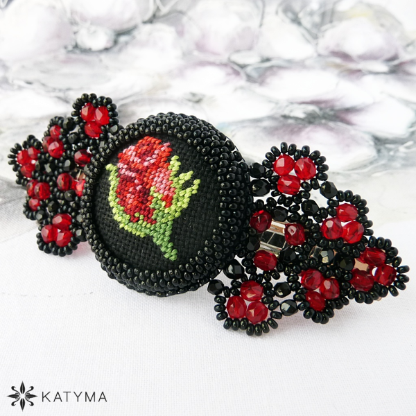 Zobrazit v plné velikosti Dámská šitá francouzská spona do vlasů vytvořená z ručně vyšívaného buttonku s poupětem růže.