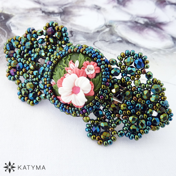 Zobrazit v plné velikosti Dámská šitá francouzská spona do vlasů šitá z kabošonu z polymerové hmoty s květinami.
