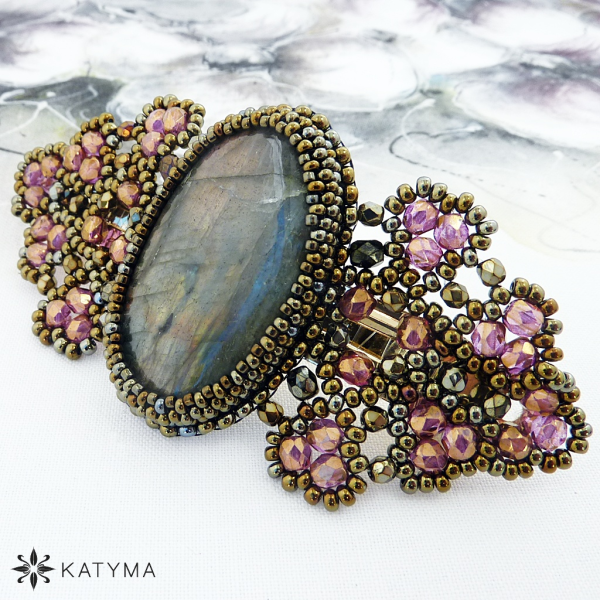 Spona je vytvořena z minerálu ve tvaru oválu. Kabošon je obšitý kulatým rokajlem Preciosa a toho-rokajlem stejné barvy.
