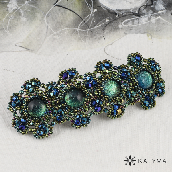 Spona je vytvořena ze 4 obšitých malovaných kabošonů. Kabošonky jsou obšité kulatým rokajlem Preciosa a toho-rokajlem stejné barvy.